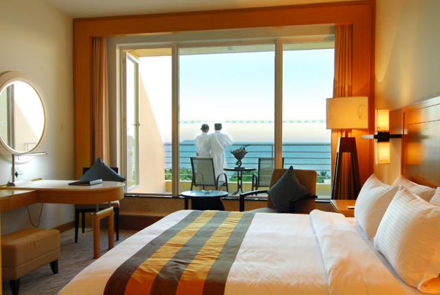 高級海景房,面積42平方米,樓層3-4層,有陽臺,180度海景,前面有遮擋物,大床(1.8*2米),雙床(1.2*2米),有浴缸,免費(fèi)寬帶